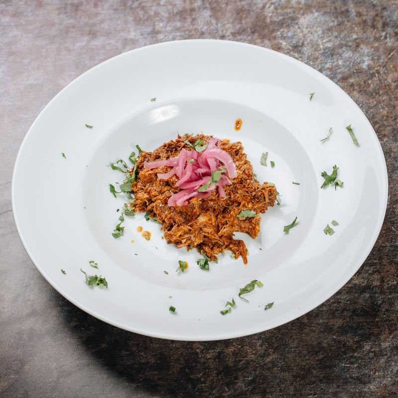 Braised pork, pickled red onion, chile de Arbol salsa, cilantro.
