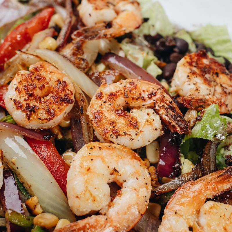 Romaine lettuce, grilled onions, roasted bell pepper, poblano peppers, and corn, served with black beans, topped with cilantro lime dressing. serve with grilled chicken breast, steak, or shrimp.