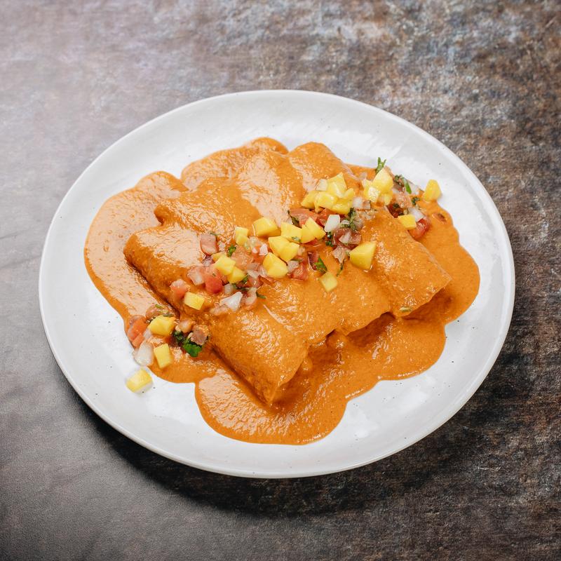 Bolio stuffed with carnitas, beans, pickled onion, avocado, and doused in a spicy tomato sauce.